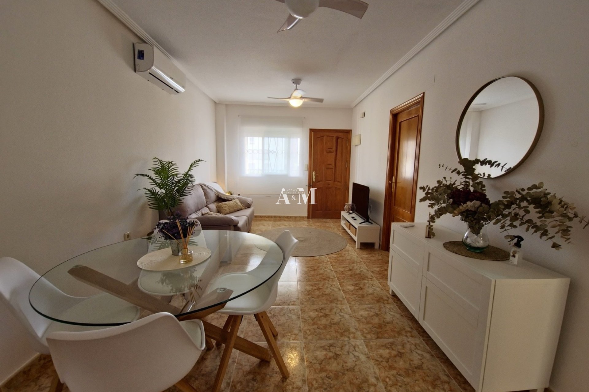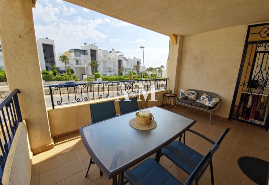 Apartment in a private residential area, located in Punta Prima, a very convenient location, as all services and shops are within walking distance. 1.7 kilometers from the beach. The 80 m² house (living area: 70 m²) consists of 2 bedrooms and 1 bathroom, a living room with a separate kitchen with a laundry room, and a large covered terrace. The house is fully equipped and furnished, and has air conditioning. Residential area with a pool and communal parking.