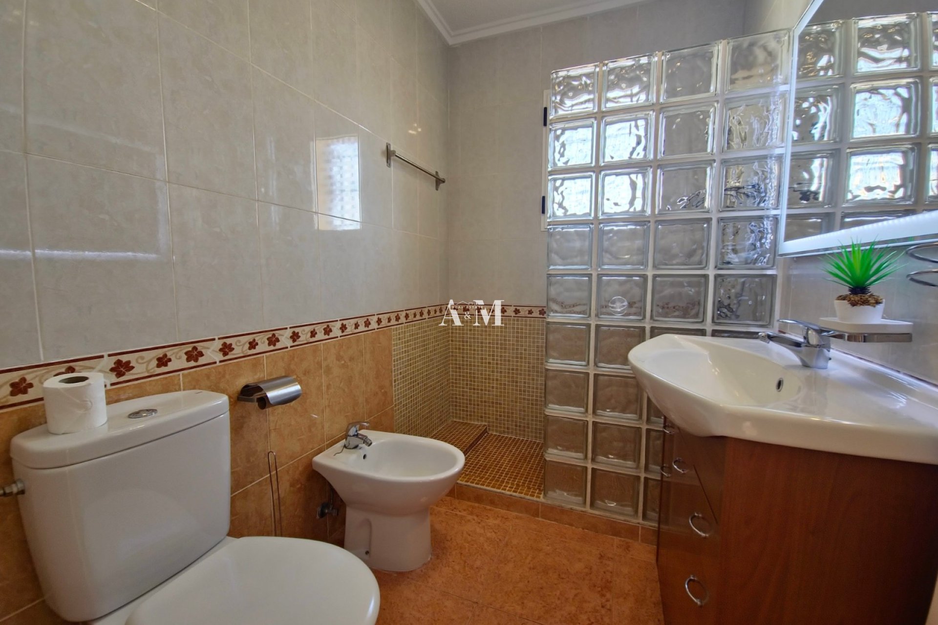 This nice house is located in residencial area of Orihuela Costa - Los Altos, with communal swimming pool and green areas. With sea views from solarium and all the terraces. Spacious and bright, south facing 3 bedrooms quad with corner garden. 2 bathrooms, independent kitchen with patio, living-dining area, covered entrance terrace, yard. Private parking. The house is furnished, equipped with white good and has air conditioners installed.